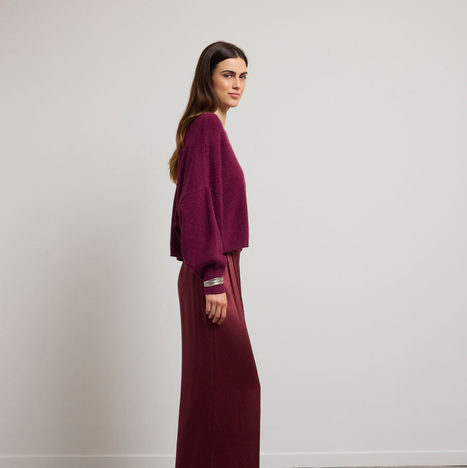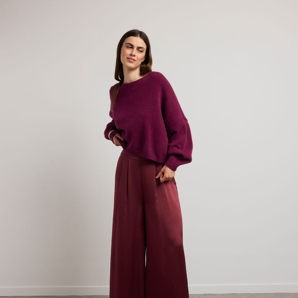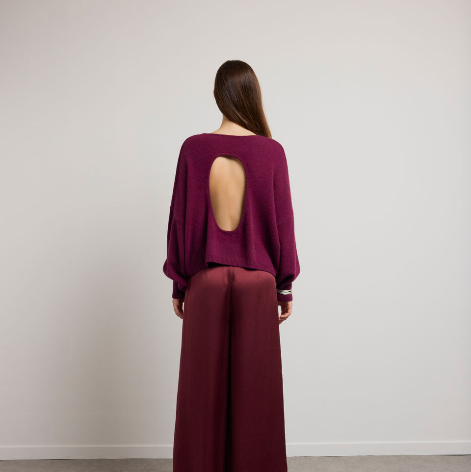 Realizzato in una maglia morbida e calda , BIRKIN è un maglione dal taglio oversize con ampia schiena scoperta arrotondata . La scollatura a barca e le maniche lunghe offrono comfort e fluidità . Il contrasto tra il davanti avvolgente e la schiena scoperta crea un look unico, tra morbidezza e sensualità . Da indossare con pantaloni fluidi o jeans, per un look invernale da città deciso.