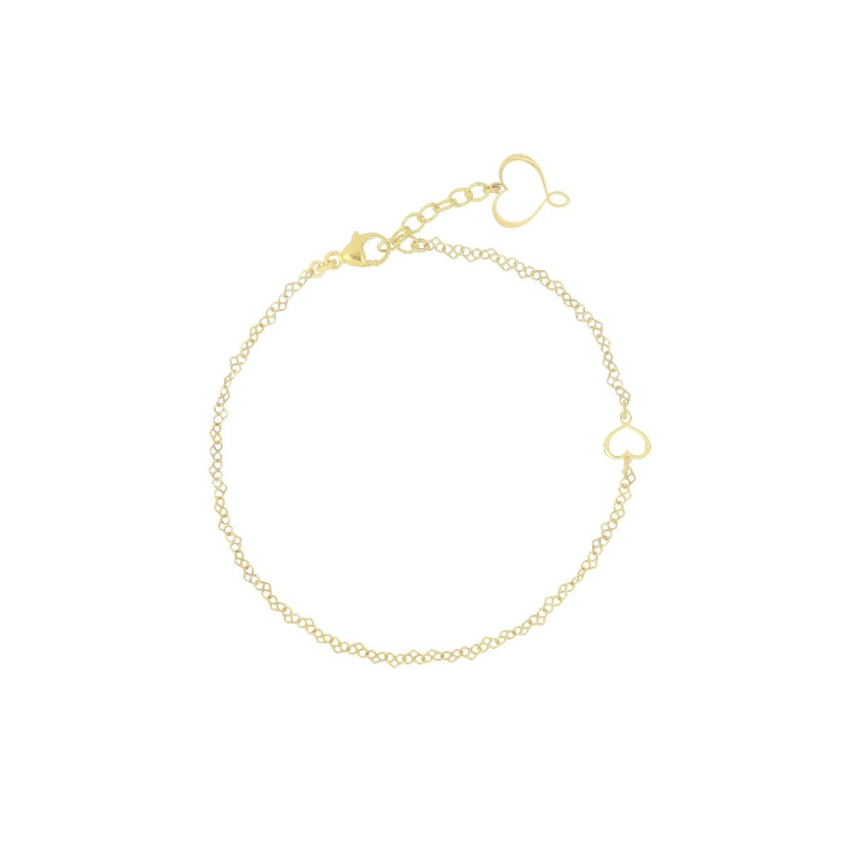 Bracciale in argento 925 con galvanica oro giallo ad alto spessore e ad alta resistenza. Il bracciale presenta una catena composta da intreccio di cuori e un cuore maman.