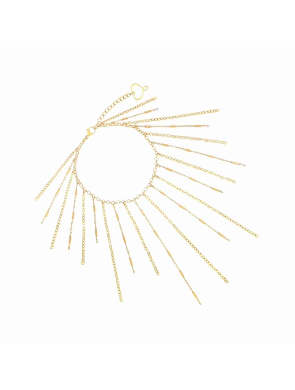 Bracciale realizzato in argento 925 con galvanica oro giallo ad alto spessore e resistenza con frange di catene pendenti.