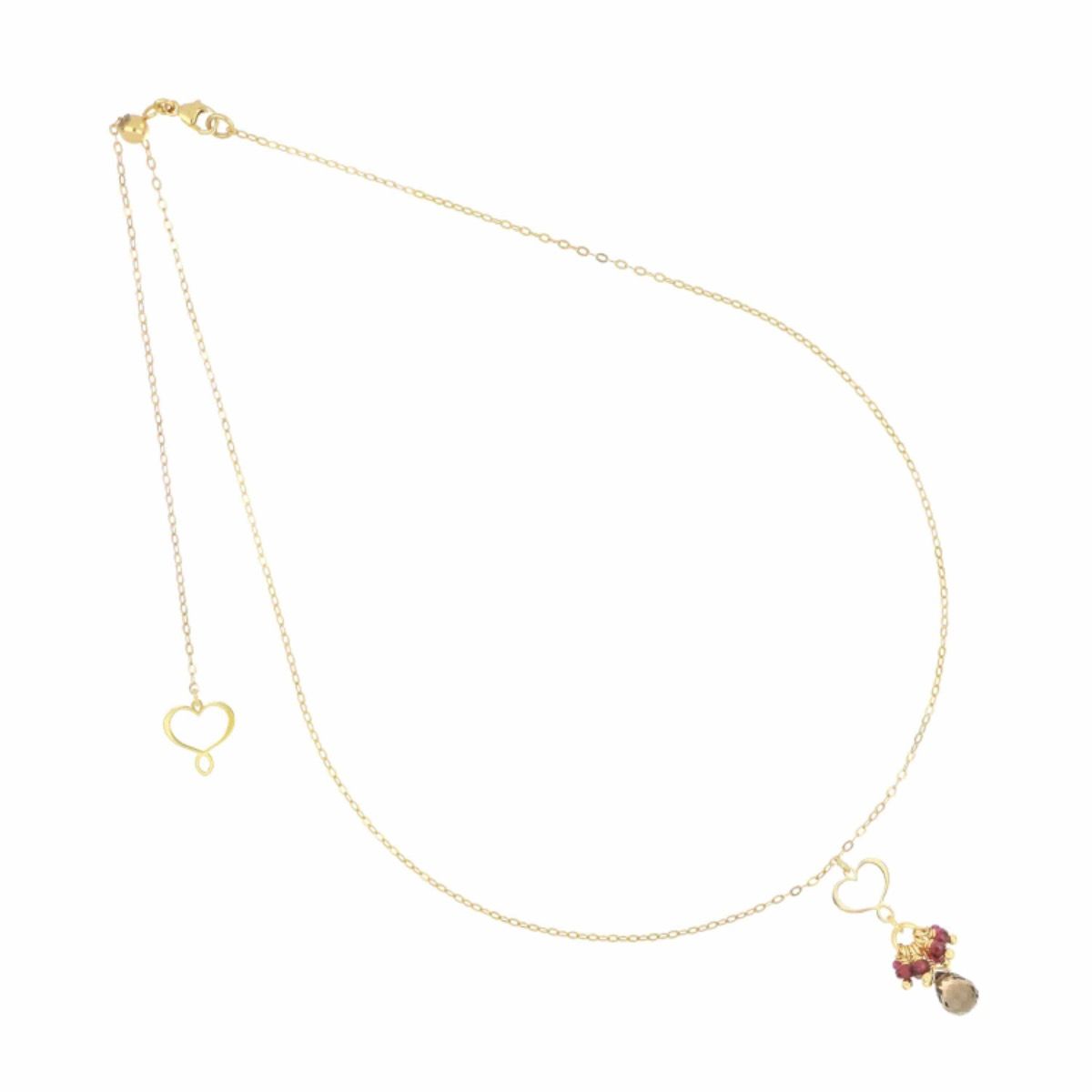 Presenta un cuore Maman, pietre di rubino e granato e goccia di quarzo fumé pendente.