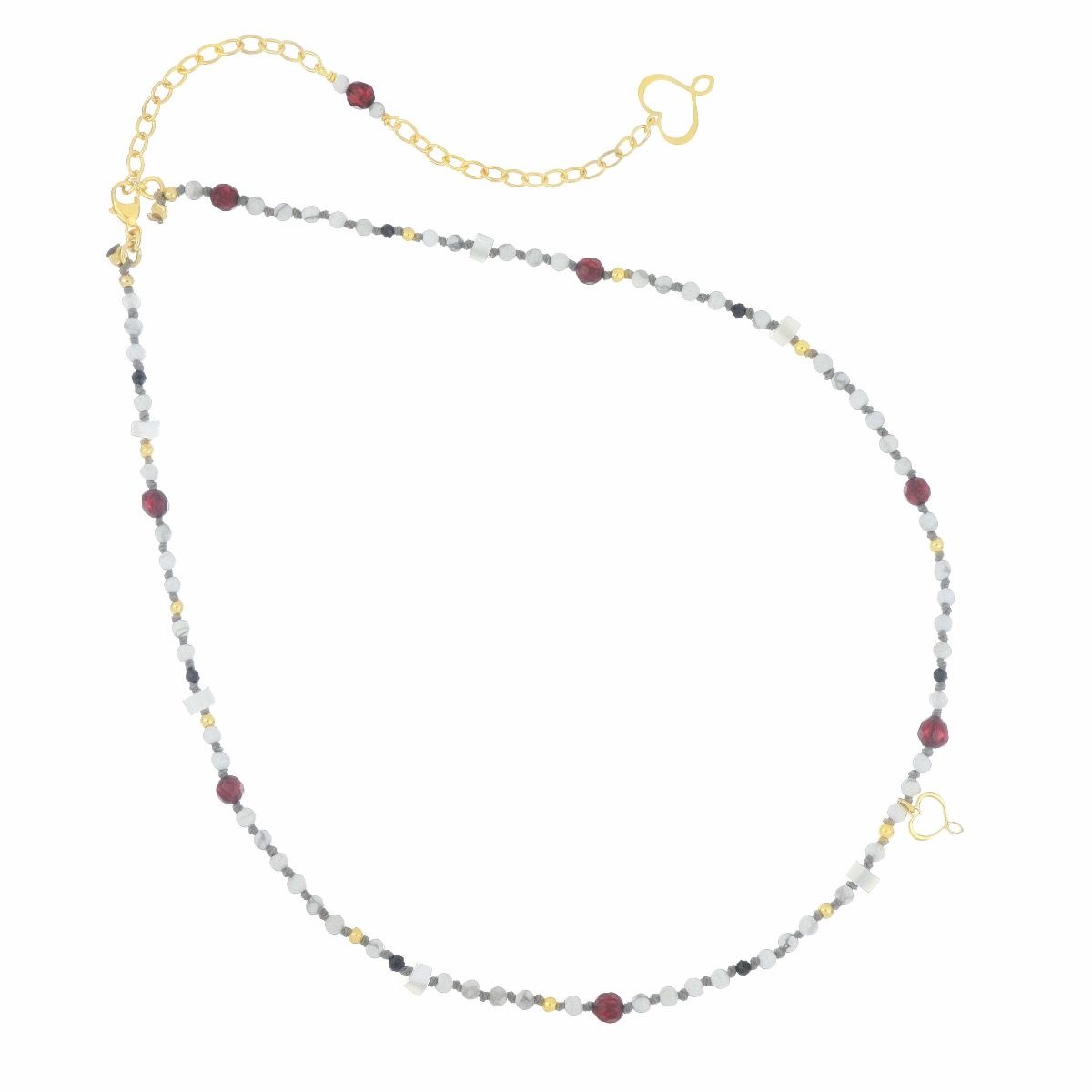 Girocollo in argento 925 con galvanica oro giallo ad alto spessore e ad alta resistenza. Il girocollo è ricoperto per tutta la sua superficie da pietre di aulite, madreperla, spinello e granato in diverse dimensioni alternate a nodi e sfere decorative.